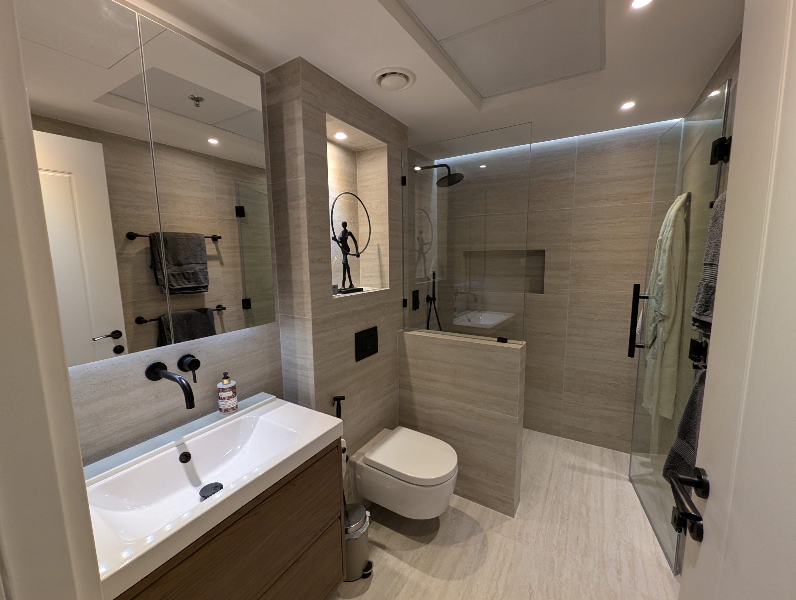 Both bathrooms were completely redone with high-quality finishes, and thoughtful storage solutions were integrated throughout the design, including five custom-built closets that blend seamlessly into the space.